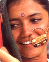 Young Ahir women wear most complicated costumes. They normally wear gathered skirts of red, green, blue, orange or brown tied and dyed cotton which are attached and decorated with charming embroidery work. Middle young women wear ‘odhanis' of red and black lined with overstated border and the old women wear simple black cotton tube skirts.